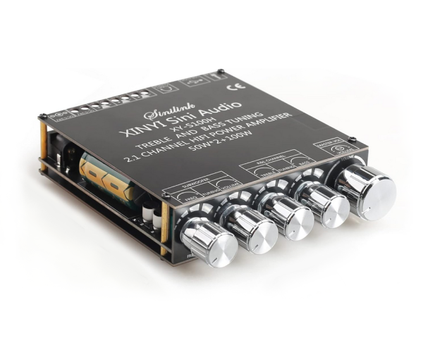 Sinilink XY-S100H — это современный 2.1-канальный аудиоусилитель класса D на базе микросхем TPA3116D2. Он обеспечивает мощный и чистый звук: по 50 Вт на каждый стереоканал и 100 Вт на канал сабвуфера. Благодаря встроенному модулю Bluetooth усилитель поддерживает беспроводное подключение на расстоянии до 15 метров без потери сигнала.