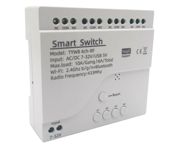 Умное 4CH Wi-Fi реле Tuya Smart — это современное решение для удалённого управления устройствами и автоматизации дома. Совместимо с приложениями Tuya Smart и Smart Life, поддерживает управление через Wi-Fi, Bluetooth и 433 МГц. Работает от 7–32 В AC/DC или 5 В через Micro-USB, выдерживая до 10 А на канал и 16 А суммарно.